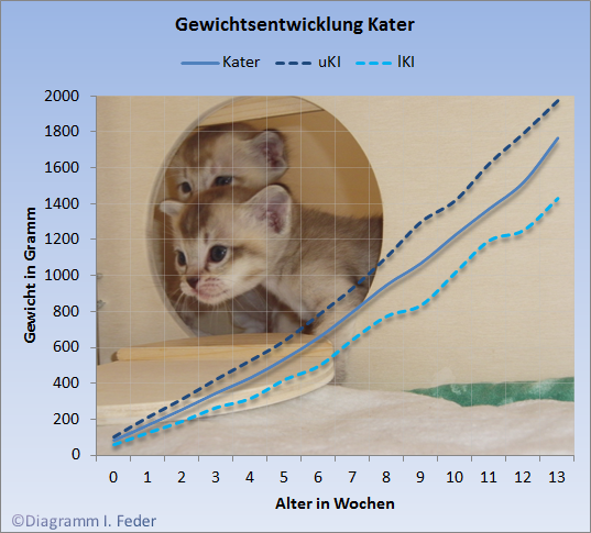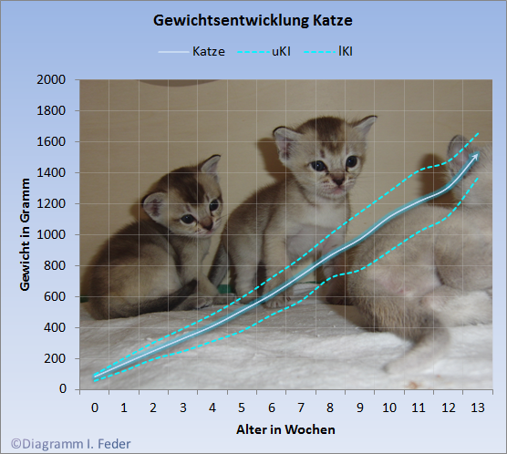 Für diese Studie habe ich mich bemüht Züchter zu finden, die mit sehr unterschiedlichen Linien züchten um auszuschließen nur engverwandte Linien zu untersuchen. Dies ist gelungen. Die Gewichtsentwicklung wurde für männliche und weibliche Tiere getrennt untersucht, dazu die Abweichungen der einzelnen Tiere vom Mittelwert. Insgesamt wurden 172 Tiere aus 32 Würfen aus den Jahren 2004 – 2014 regelmäßig gewogen. Unser weiblicher Katzennachwuchs bleibt bei der Gewichtszunahme deutlich hinter den Katern zurück. Klar, Kater sind größer und schwerer als Kätzinnen, das ist bekannt. Überraschend aber bei den Detailuntersuchungen, dass in der achten bis zehnten Woche viele Kitten vom Mittelwert nach unten abweichen, also eine verringerte Gewichtszunahme zeigen. Befragt man die Züchter so ist ein wesentlicher Grund dafür, dass die Kitten bei der Nahrungsumstellung auf diverse Futtersorten manchmal Durchfall bekommen und einige Tage mit Gewichtsstillstand oder Gewichtsabnahme reagieren. Für die Züchter insbesondere Neuzüchter sind diese Diagramme eine Hilfe, können sie jetzt kontrollieren, ob sich ihre Burmakitten altersgerecht entwickeln. Was für die Käufer und Kittenübernehmer fehlt, ist die Fortsetzung der Gewichtsentwicklung nach der 12. Woche. Aus diesem Grund suche ich Kittenkäufer, die bereit sind, jeden Monat ihr Tier bis zum ersten Lebensjahr zu wiegen. Dann kann auch diese Wissenslücke gefüllt werden. Mein Dank geht an Karen Bücken, Dagmar Eßer, Familie Gronemann, Marlies Koorenneef und Sonja Vogels, die dieses Projekt tatkräftig unterstützt haben. Für die statistische Aufarbeitung und das Layout bedanke ich mich bei meiner Tochter Inke Feder. Annelie Feder